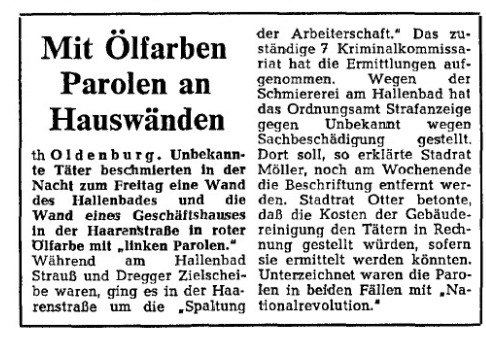 Die Schläge, die ich empfangen hatte, stärkten meine widerständige Haltung. Ein Jahr später wollte ich an der Gründungsversammlung der „Aktion Widerstand“ teilnehmen, die am 31. Oktober 1970 in Würzburg stattfand. Sobald alle Familienmitglieder schliefen, machte ich mich auf den Weg zu dem Treffpunkt in der Oldenburger Innenstadt, von wo aus mehrere Fahrzeuge Richtung Würzburg starten wollten. Den Treffpunkt erreichte ich kurz nach Mitternacht. Die Stunden bis zur vereinbarten Abfahrtszeit vergingen quälend langsam. Die Nacht war fast vorüber, und die Abfahrt stand kurz bevor, als die Polizei mich aufgriff. Irgendjemand hatte sie auf den minderjährigen Nachtschwärmer aufmerksam gemacht. Damit war die Fahrt nach Würzburg vereitelt, denn ich wurde meinen Eltern übergeben. Ich war jetzt 13 Jahre alt.